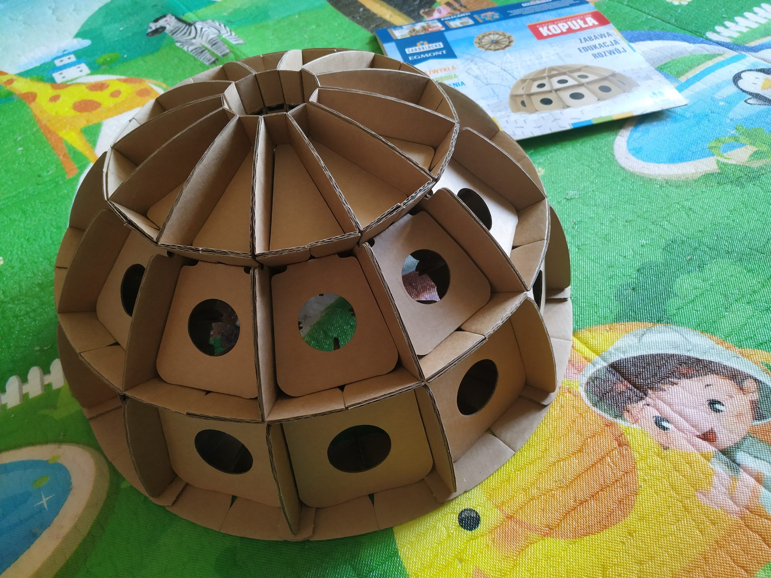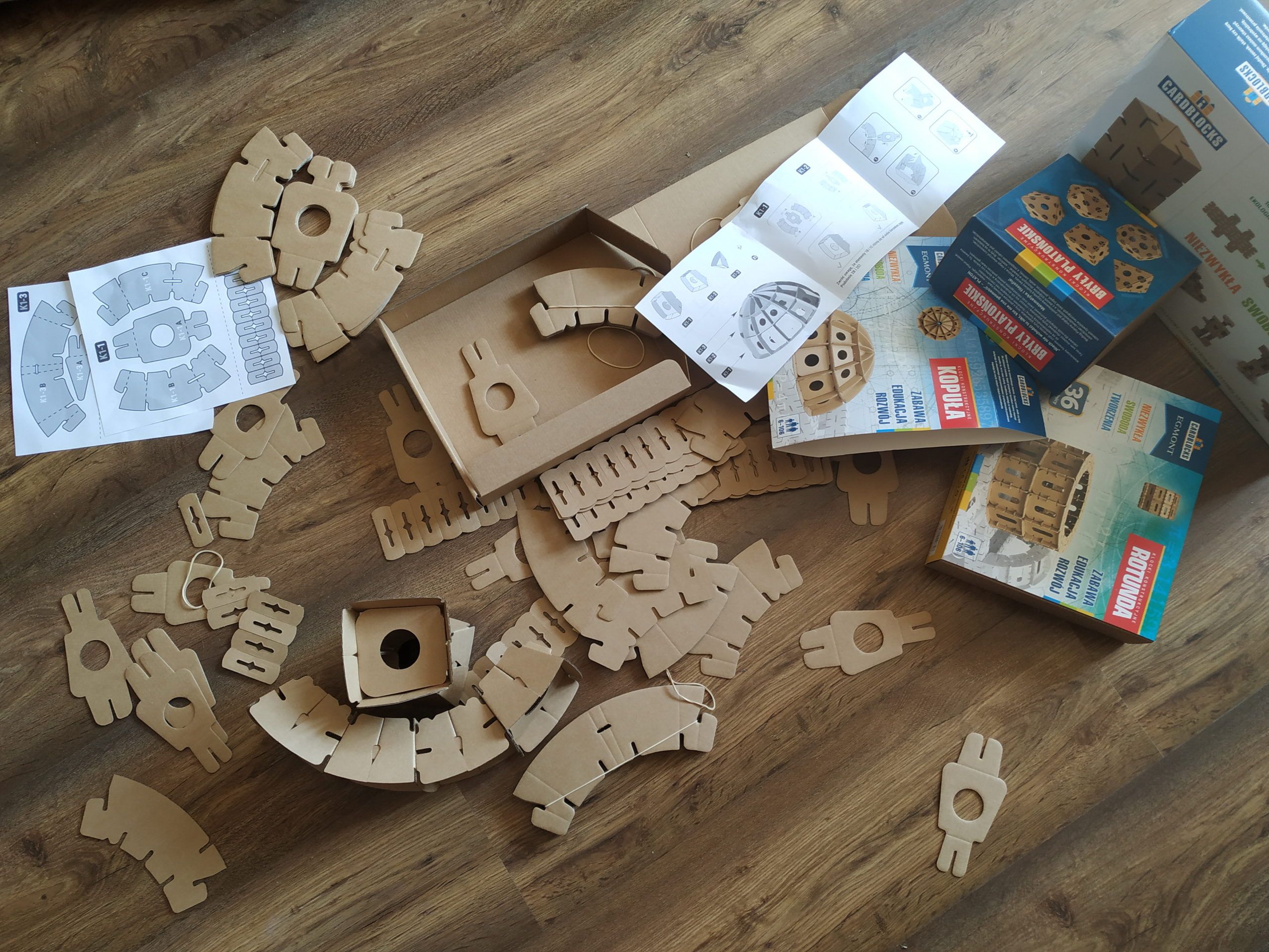 Nam zajmowało to trochę więcej czasu, bo współpracował z nami roczny pomocnik, który wyspecjalizował się w mieszaniu klocków z łącznikami. W czasie tej uciążliwej pracy nie ucierpiał żaden element, co jest doskonałym dowodem na to, że zabawka jest odporna na uszkodzenia. Okazuje się, że to specjalny rodzaj mocnej tektury z domieszką makulatury. Mamy tu zatem i akcent ekologiczny i niezbędne certyfikaty ekologii oraz bezpieczeństwa dla dzieci. A takie szczegóły zawsze chwytają mnie za serce.
