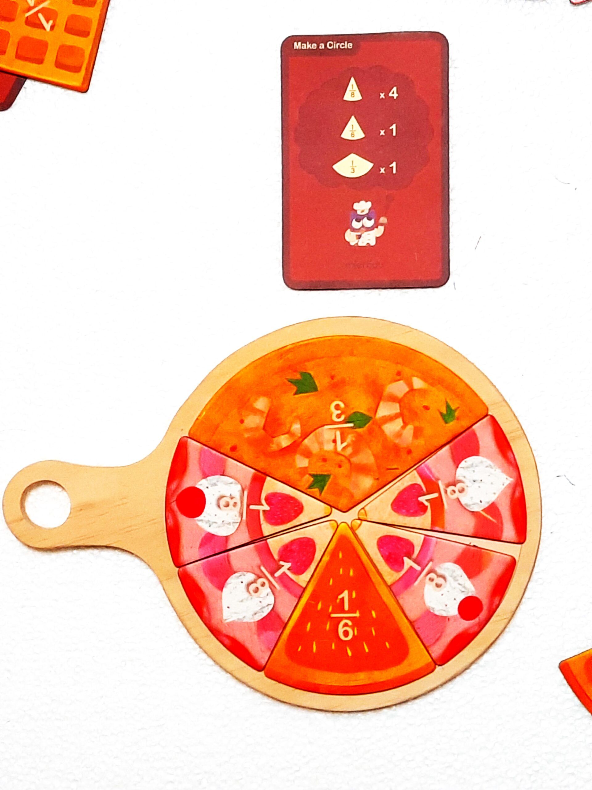 Zabawka jest bardzo solidna, wszystkie elementy magnetyczne wykonane są z grubej tektury. Kartoniki są dwustronne , z jednej strony znajdziemy rysunki znanych potraw i dań a z drugiej kolor, który reprezentuje dany ułamek np. z jednej strony jest gofr a z drugiej kolor czerwony, który w układance odpowiada ułamkowi ¼. Barwna szata graficzna z ulubionymi daniami, deserami lub owocami,  wręcz zachęca do nauki ułamków.