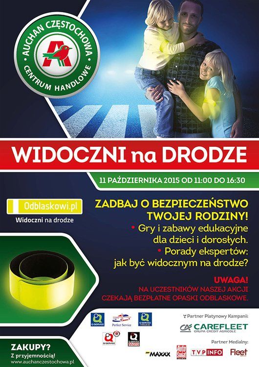 Wszyscy, którzy w niedzielę 11 października odwiedzą Centrum Handlowe Auchan Częstochowa w Poczesnej, otrzymają odblaskowe opaski. Najmłodsi będą mogli wziąć udział w grach edukacyjnych, rozwiązać krzyżówki i rebusy, a także wziąć udział w zajęciach plastycznych, których tematem będzie bezpieczne poruszanie się po drodze i zachowanie na przejściu dla pieszych. Z kolei dla dorosłych przygotowano specjalne edukacyjne broszury.