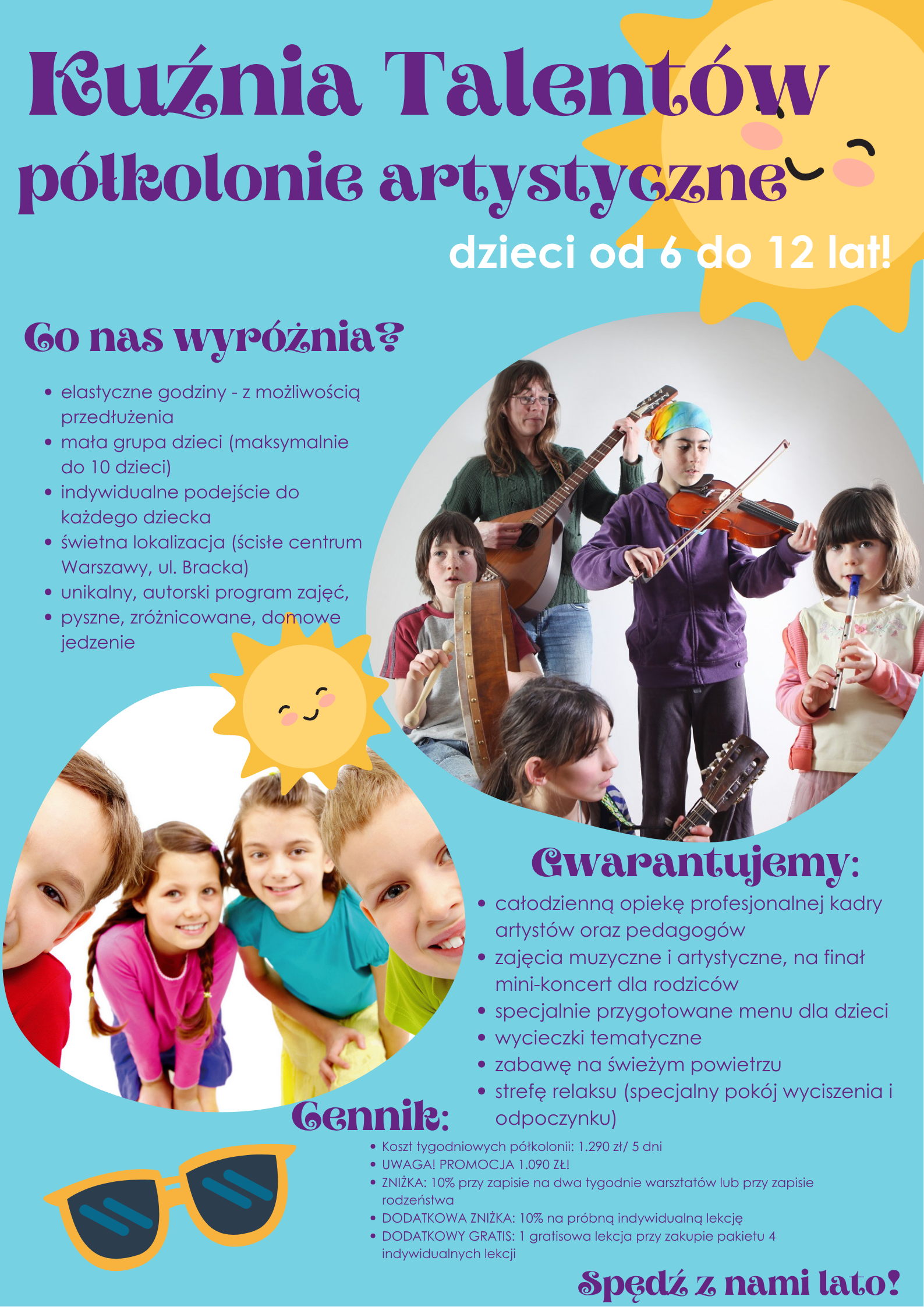 Obecnie trwa promocja cenowa – tylko 1.090 zł za tydzień półkolonii (zamiast 1.290 zł).Dodatkowo:🎁 10% zniżki na drugi tydzień lub dla rodzeństwa🎁 Lekcja próbna gratis przy zakupie pakietu zajęć indywidualnych
