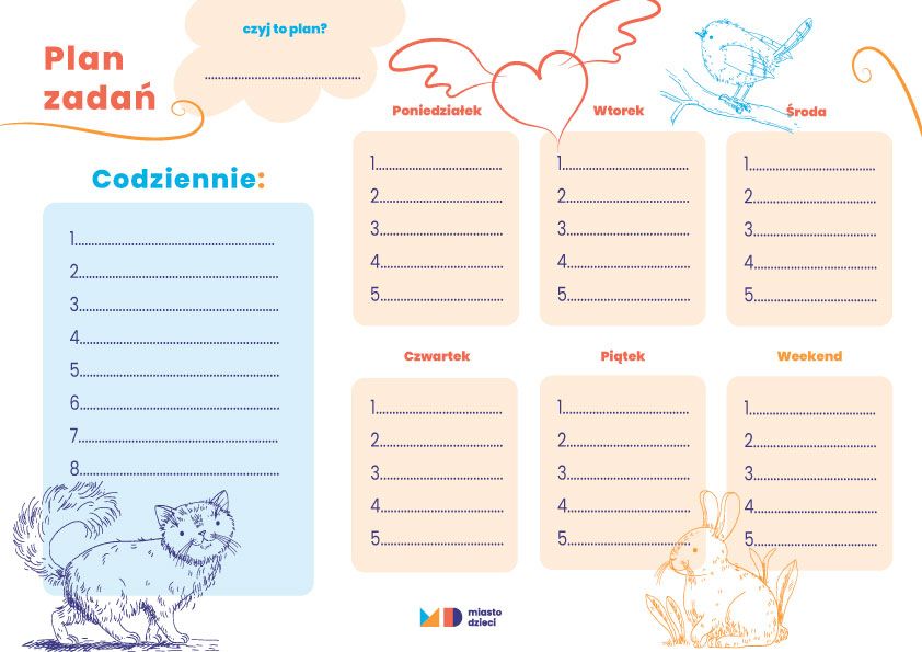 Czy planowanie obowiązków może być zabawą? Oczywiście! Pobierzcie i wydrukujcie bezpłatny planer obowiązków dziecka, który potem będziecie wspólnie wypełniać. Planer pozwoli dziecku lepiej zarządzać czasem i pamiętać o codziennych zadaniach, takich jak sprzątanie pokoju, odrabianie lekcji czy inne obowiązki domowe. Organizer obejmuje cały tydzień, dzięki czemu dziecko może śledzić swoje postępy i regularnie wykonywać przypisane mu zadania. Można go postawić na biurku, powiesić na drzwiach lub ścianie, co czyni go praktycznym i łatwo dostępnym. Regularne korzystanie z planera rozwija u dzieci nawyk systematyczności, uczy odpowiedzialności, organizacji i planowania.